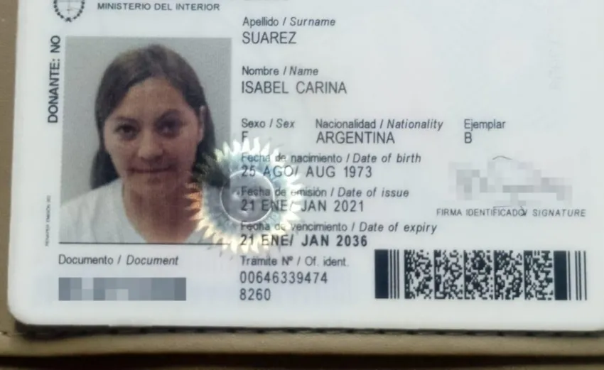 Entre los documentos hallados en la billetera se encuentra el DNI a nombre de Isabel Carina Suárez. La billetera fue encontrada en el negocio Castellanas, y la mujer que la encontró está desesperada por devolverla.